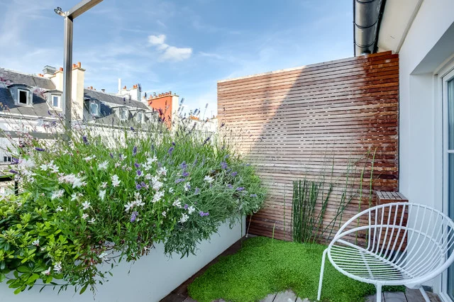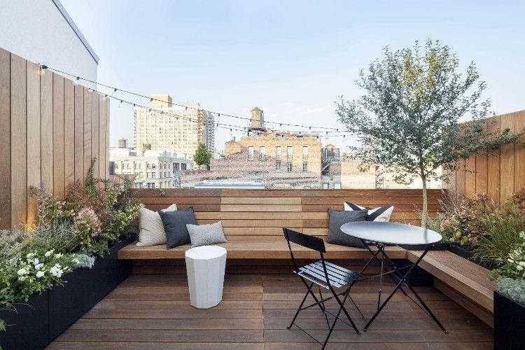 Untuk melengkapi balkon desain lantai kayu, tambahkan tanaman menjalar untuk melindungi area balkon dari teriknya cahaya matahari saat bersantai di siang atau tengah hari. Buat pembatas dengan kaca transparan setinggi perut untuk menjadikan akses pandan mudah walaupun sedang duduk.