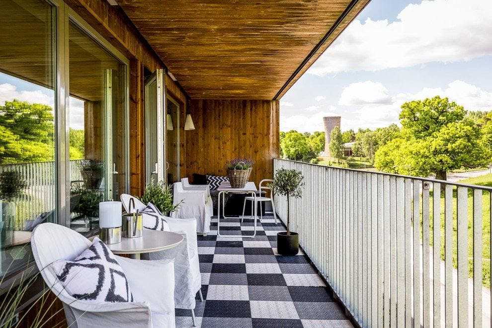 Desain ini bertema kayu, membuat balkon akan tampak unik dan berbeda. Letakkan sejumlah barang furniture di balkon beserta lampu-lampu dan beberapa pot tanaman hijau, balkon bisa menjadi sebagai tempat nyaman untuk melepas penat setelah bekerja seharian penuh.