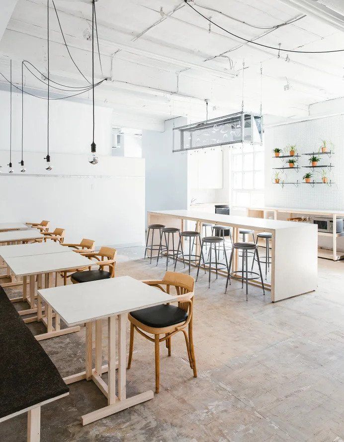 Dominasi warna putih pada interior cafe perlu diterapkan agar menjadikan ruangan tampak jauh lebih luas. Bukan hanya luas saja, cafe dengan interior serba putih juga akan memberikan kesan bahwa ruangan tersebut terlihat bersih.