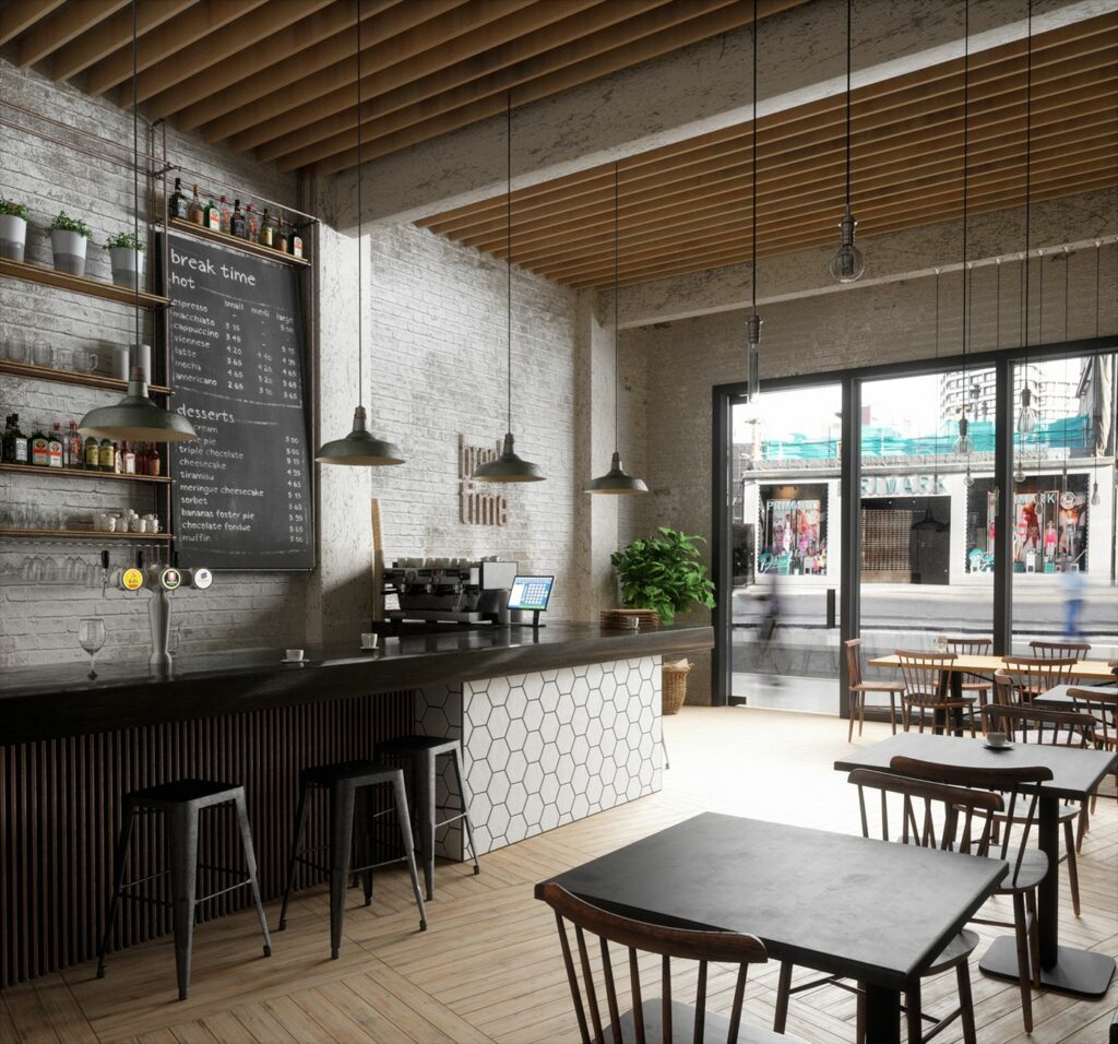 Memiliki cafe yang dibangun di lahan terbatas tidak hanya melulu menerapkan konsep warna terang pada sisi interior saja. Pemilik cafe masih bisa menerapkan ide konsep lain yang akan membuat tampilan terlihat mempesona. Misalnya, cafe dengan konsep industrial serba minimalis.