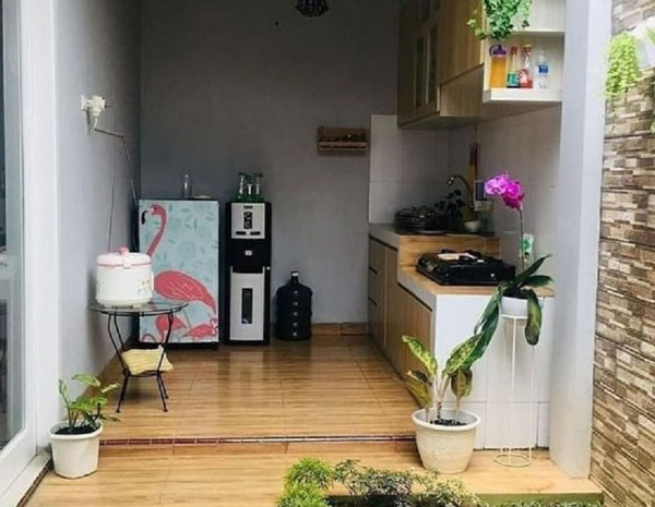 Dapur ini sangat minimalis dan menempel dengan bagian utama meski tidak memiliki pintu atau langsung terbuka. Akses ke bangunan utama juga cukup mudah sehingga bisa dipakai kapanpun.