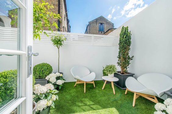 Area kecil ini hanya menggunakan dua warna yaitu putih untuk dinding dan kursi, serta warna hijau dari tanaman alami dan rumput sintetis namun sudah terlihat sangat cantik.