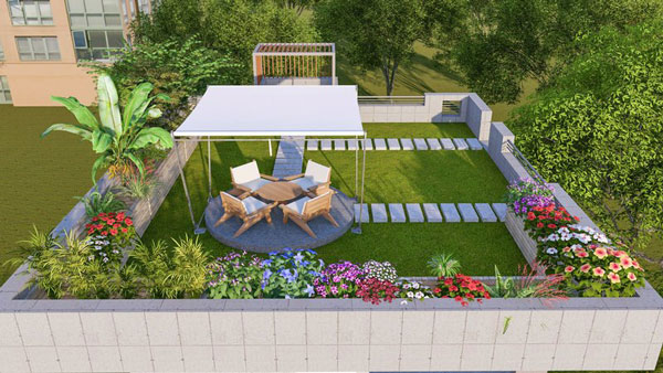 Adanya rumput sintetis yang menutup seluruh permukaan lantai membuat rooftop ini seperti taman bunga di atas rumah. Beberapa jenis tanaman hijau lain juga bisa ditambahkan agar pandangan mata tidak terlalu penuh dengan bunga aneka warna.