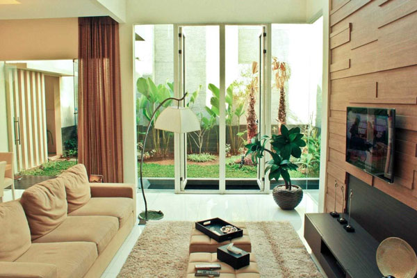Pencahayaan alami dari jendela kaca ditambah dengan pemandangan hijau dari luar benar-benar membuat ruang ini menjadi lebih hidup. Satu set sofa modern yang dipasangkan dengan karpet berwarna senada juga akan membuat ruang secara keseluruhan tampak indah.