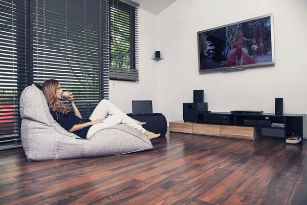 Jika tak ingin repot memilih dan memasukkan banyak perabot tapi tetap ingin kenyamanan ekstra di ruang TV Anda, maka bisa memilih satu bean bag besar dengan sandaran seperti foto di atas.
