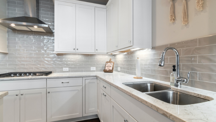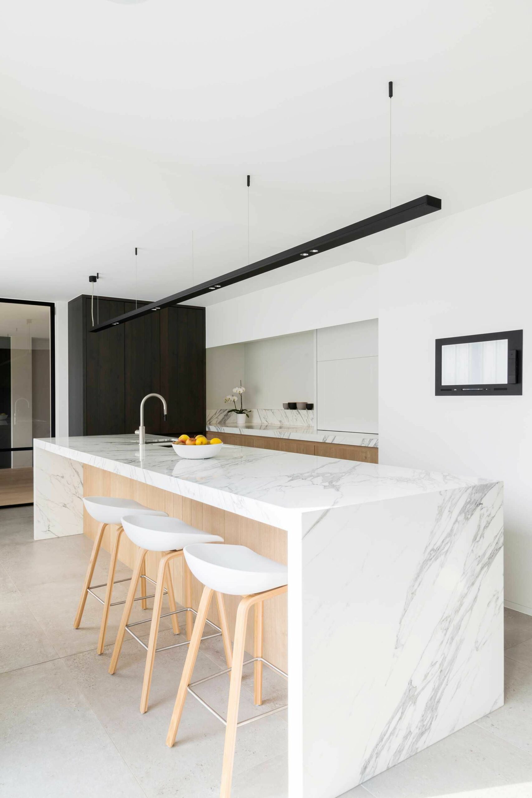 Marmer dikenal sebagai pelengkap dekoratif. Di dapur, penggunaan marmer sebagai pelapis meja dapur dipilih sebagai cara menaikkan estetika desain tempat cuci piring dan kompor. Dapur serba putih dengan aksen kayu memberi estetika yang rapi dan menimbulkan ilusi ruangan yang luas.