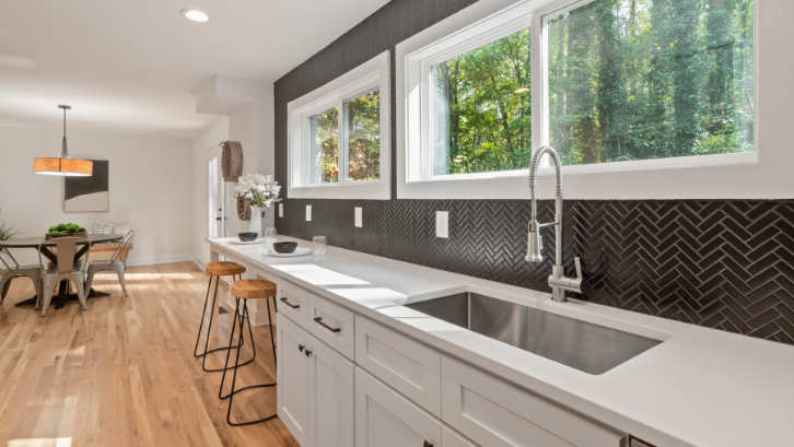 Desain tempat cuci piring dan kompor mewah tidak harus mahal, dengan biaya terbatas pun dapur bisa terlihat menawan. Kuncinya dengan menggunakan meja dapur yang dominan putih. Jika ada dana lebih, lantai dapur bisa diubah menjadi papan kayu.