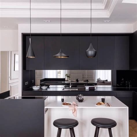 Sebagai penerangan, pilihlah lampu-lampu gantung hitam dan pasang di atas meja tengah guna meningkatkan citra dapur.