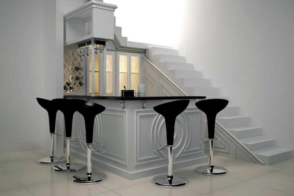 Sayangnya, jika sebuah hunian mempunyai gaya interior modern, gaya keempat diatas kurang cocok untuk diterapkan. Bagi pemilik rumah dengan gaya interior modern, gunakan bar dengan gaya mewah namun tetap terlihat minimalis. Bar jenis ini dapat diletakkan di dekat tangga yang menuju lantai atas.