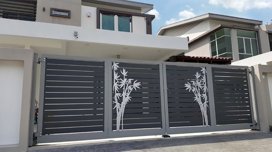Folding gate aluminium ini hadir dengan warna silver yang membuat pagar tampak modern dan elegan. Semi pagar minimalis ini juga menghadirkan desain space berukir horizontal di tengah gate. Jadi, area dalam rumah bisa mendapatkan tambahan cahaya dari area terbuka.