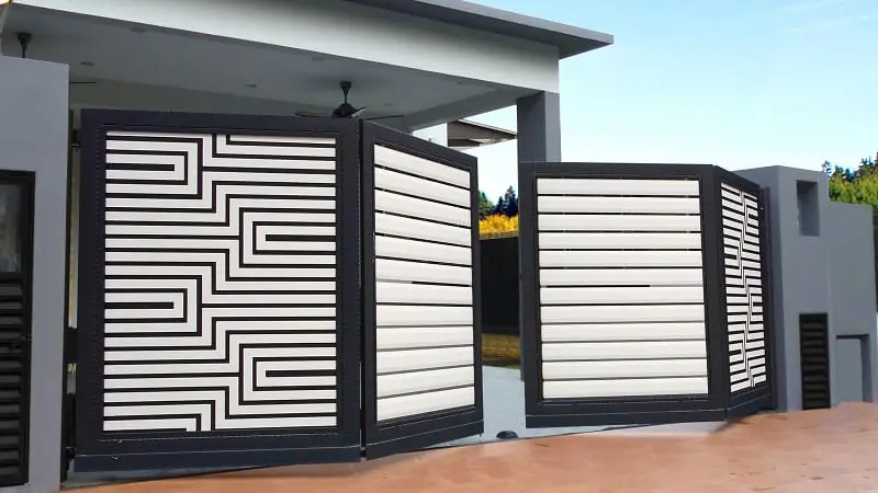 Model pagar yang mengusung dua kombinasi warna dan desain ini cocok diaplikasikan pada bangunan berarsitektur modern. Desain pagar lipat minimalis memiliki corak abstrak hitam putih dan matching dengan eksterior rumah bergaya kekinian ala milenial.