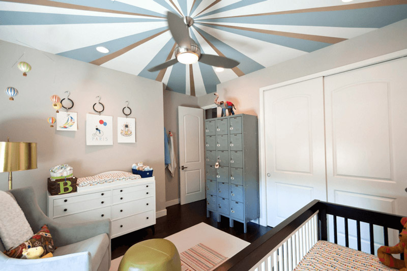 Model pengecatan juga bisa dibuat tak biasa misalnya zig-zag, garis lurus, atau lainnya. Desain plafon ini paling cocok dengan ruang kamar atau area menonton TV untuk menambah kesan ramai. Jika perlu, tambahkan juga kipas angin langit-langit yang dilengkapi dengan lampu.