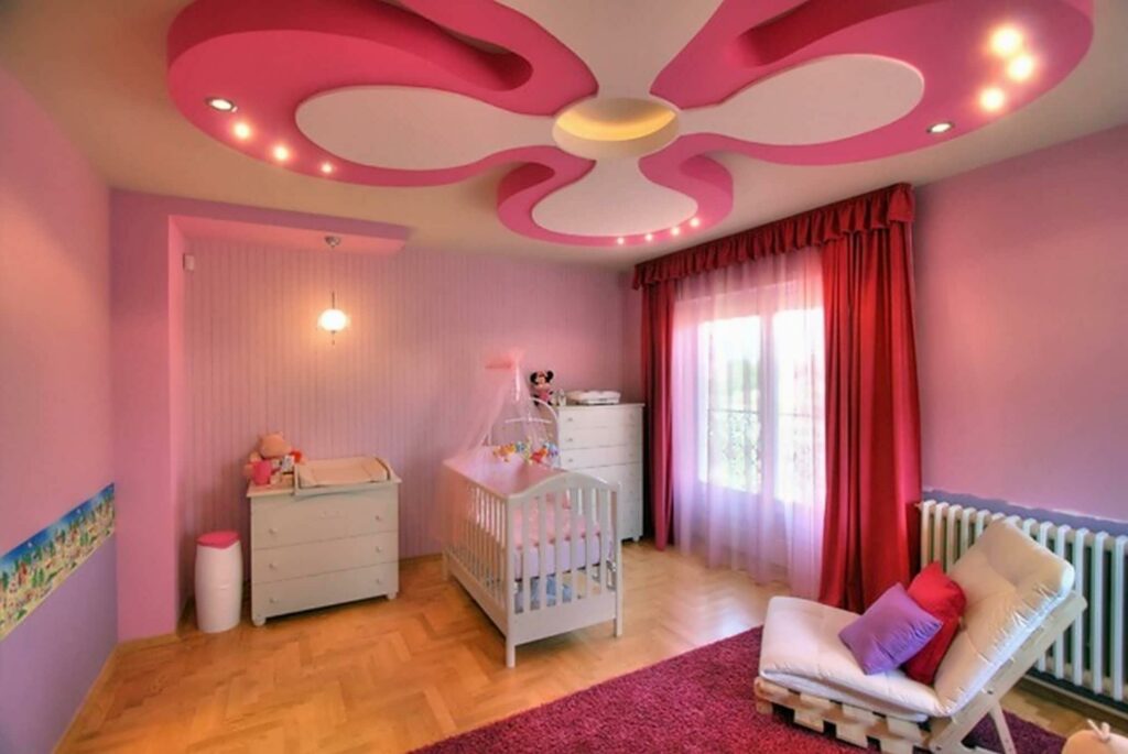 Ingin sesuatu yang mencolok di bagian atap untuk kamar tidur anak perempuan? Maka Anda bisa memilih plafon gypsum bentuk bunga berwarna merah muda yang dipadukan dengan furniture dan gorden berwarna senada.