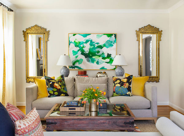 Area dinding bisa menjadi kanvas yang sangat ideal guna menampilkan dekorasi ruangan. Pemilik rumah bisa menempatkan sejumlah ornamen agar mampu menciptakan ruang tamu yang ideal. Misalnya, menempatkan bingkai lukisan, cermin dan lainnya.