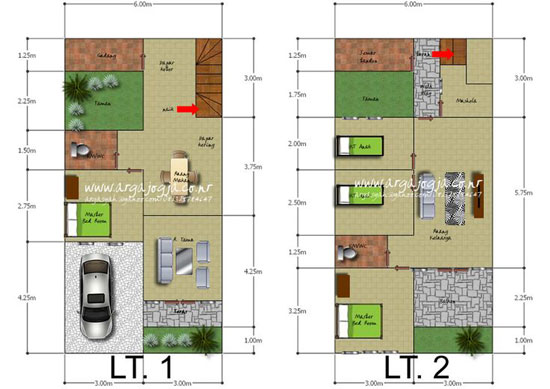 Agak berbeda dengan konsep bangunan lainnya, luas bangunan sekitar 100 m2 ini bisa dibuat rumah dengan 2 lantai. Pada bagian lantai satu terdiri atas fasilitas carport, 1 kamar tidur, ruang makan, kamar mandi, ruang tamu, dan fasilitas taman berukuran minimalis.