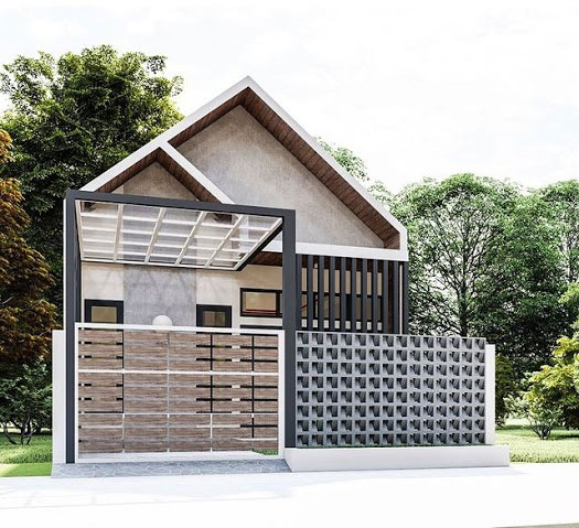 Desain pagar yang tidak terlalu tinggi dan dengan model tidak rumit hanya berupa garis-garis vertikal membuat tampilan rumah tidak penuh dari depan. Desain atap rumah ini terbagi menjadi dua membuat kesan rumah yang besar padahal berukuran kecil.