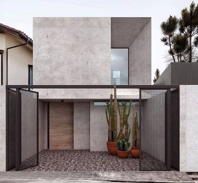 Gaya arsitektur industrial juga bisa bisa diaplikasikan pada rumah mungil bertipe 30 seperti gambar di atas. Rumah dua lantai ini menggunakan dinding beton ekspos yang dipadukan dengan tanaman tropis dan elemen besi pada bagian pagar berwarna hitam yang membuat kesan industrial sangat terasa.