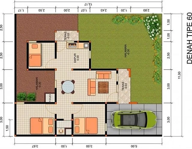 Luas bangunan dari rumah type 60 adalah 60 m2 sesuai dengan namanya, yang termasuk cukup untuk membuat sejumlah ruang yang dibutuhkan keluarga mulai dari dapur hingga ruang tamu. Bahkan jika masih ada sisa lahan, sang pemilik juga bisa memanfaatkannya untuk taman atau garasi.