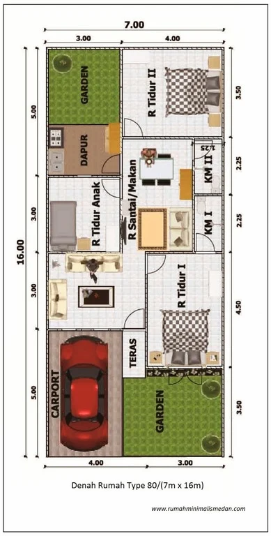 Untuk bangunan rumah ukuran 16×7 meter mungkin akan lebih cocok ketika dimanfaatkan untuk mendirikan dengan konsep yang elegan dan mewah. Mulai dari bagian depan, bangunan dilengkapi dengan fasilitas carport dan halaman dengan konsep taman.