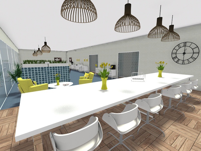 Ruangan yang terbatas juga bisa disulap menjadi kantor terbuka yang minimalis. Anda hanya perlu menambahkan sebuah meja panjang dalam ruangan lalu melengkapinya dengan jajaran kursi mungil. Tapi pastikan untuk menggunakan kursi yang nyaman agar karyawan betah duduk lama saat bekerja.