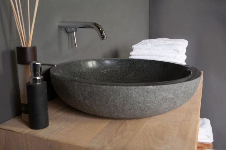 Wastafel yang memiliki warna dan tampilan seperti batu alam bisa menjadi salah satu cara mudah untuk membawa kesan alami ke dalam kamar mandi. Warnanya yang hitam membuat wastafel ini tidak mudah terlihat kotor dan ketika dipadukan dengan meja kayu, wastafel ini tampak lebih natural.